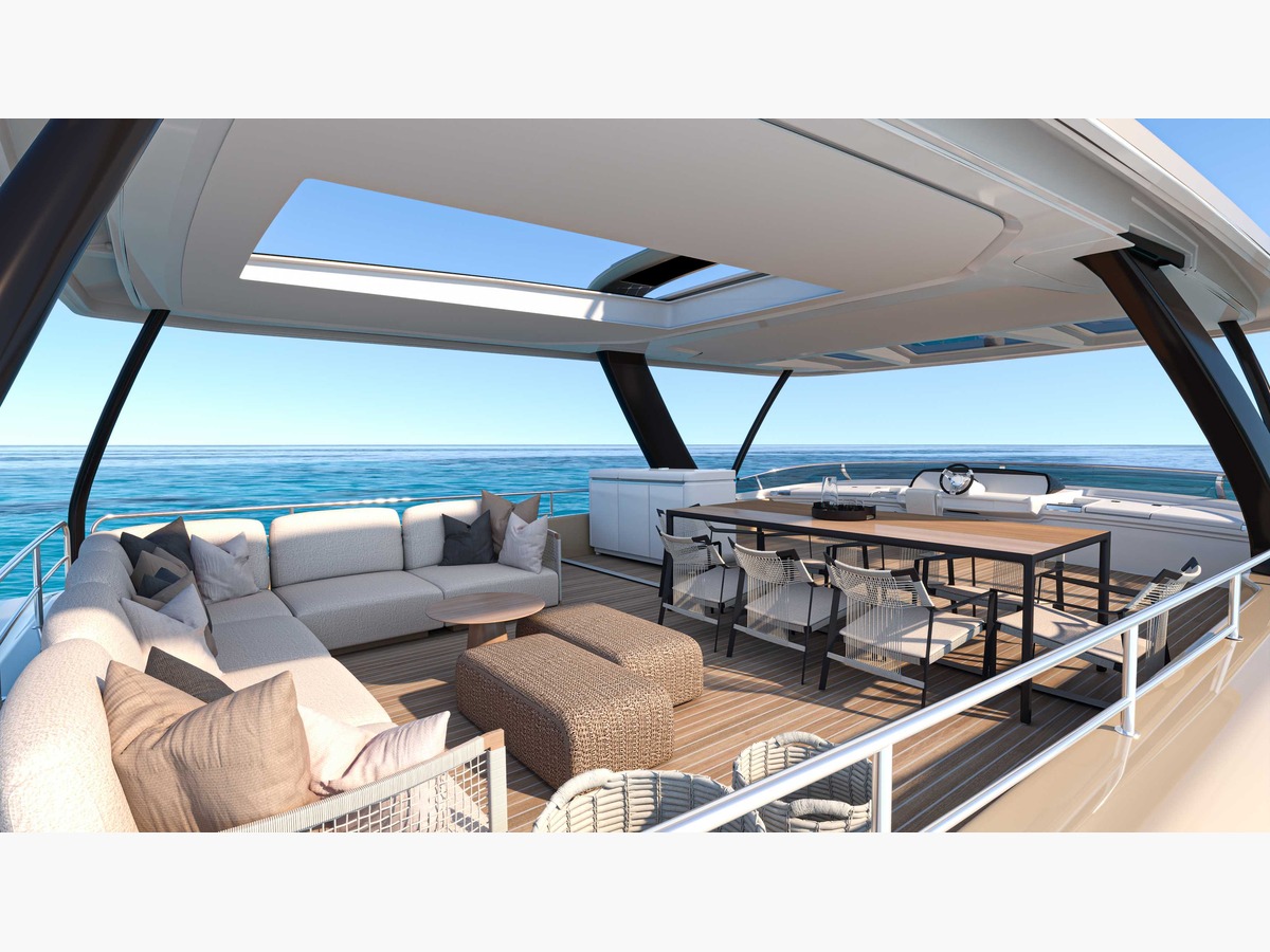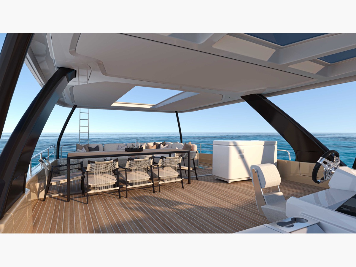 - Des espaces extérieurs généreux, avec un flybridge impressionnant et un cockpit arrière accueillant