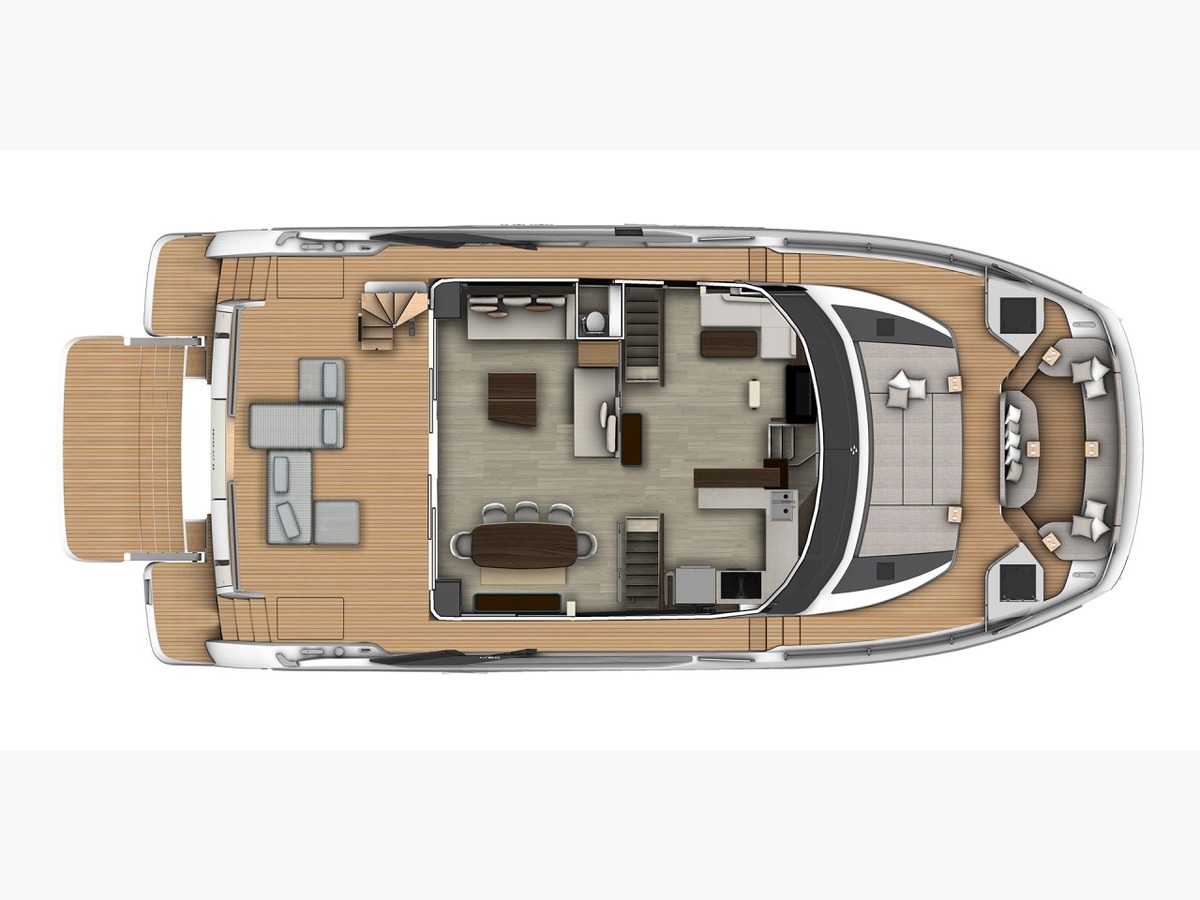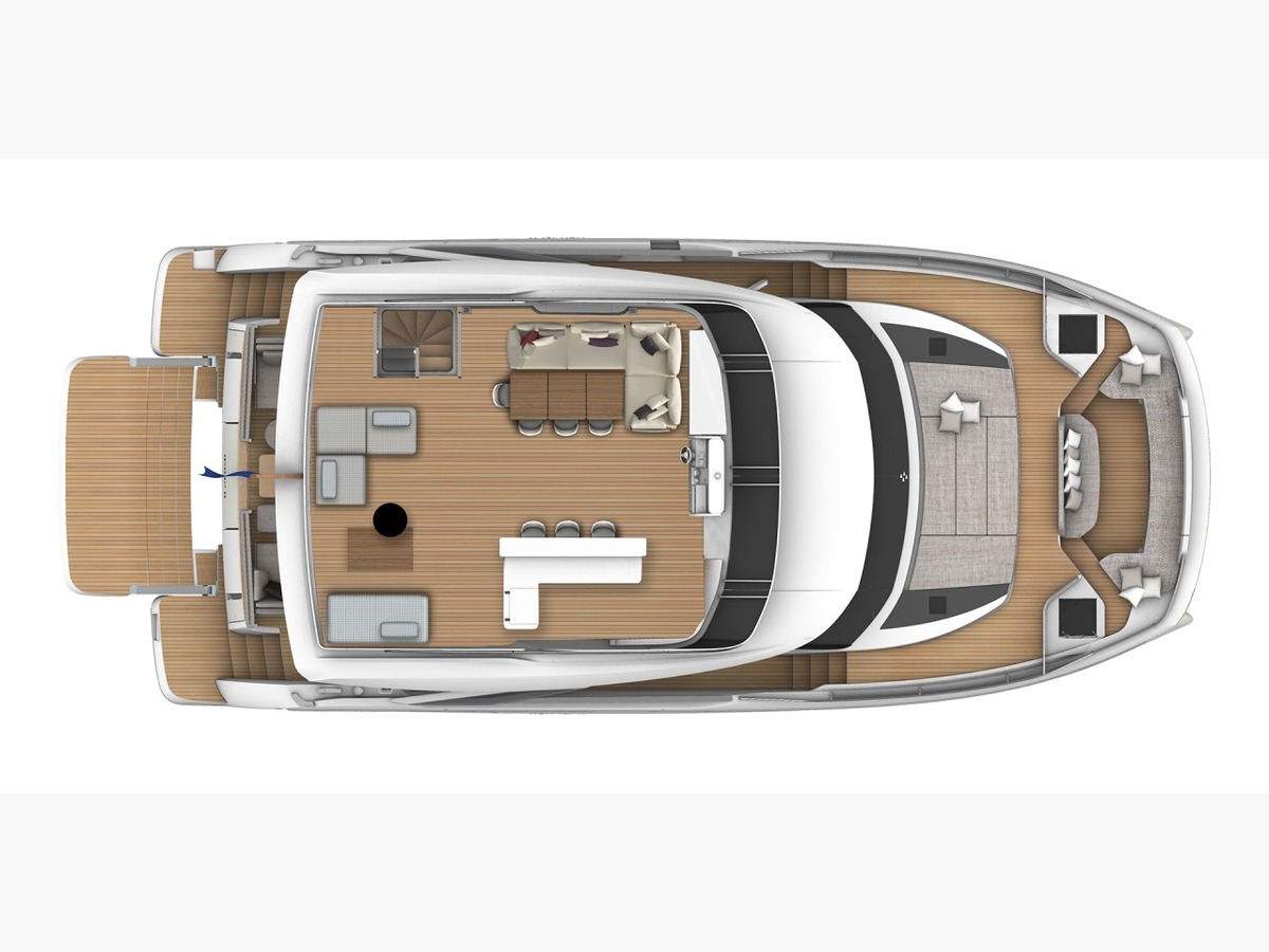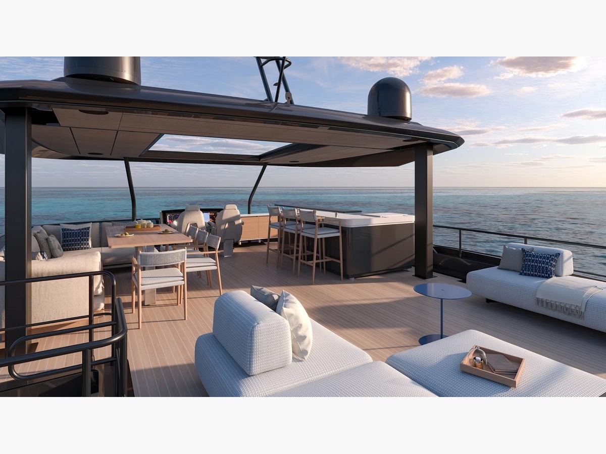 À bord, la sensation d’espace est immédiate. Le carré principal se déploie comme un véritable lieu de vie face à la mer, baigné de lumière et parfaitement ouvert sur l’extérieur. Avec près de 280 m² d’espace utile, l’expérience rivalise avec celle d’un superyacht de 90 pieds, tout en conservant une simplicité d’usage rare. La circulation est fluide, naturelle, pensée pour préserver l’intimité autant que pour partager. Le flybridge et les espaces avant prolongent ces volumes avec élégance, tandis que la plateforme arrière accueille facilement un grand tender et les équipements nautiques.