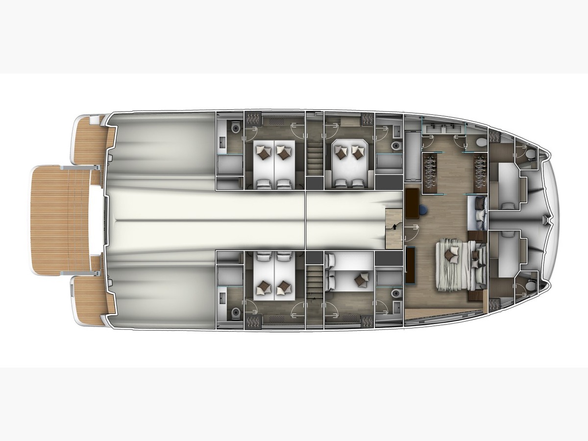 L’aménagement intérieur propose 4 ou 5 cabines, dont une suite propriétaire pleine largeur d’environ 30 m², un véritable espace privé, comparable à une suite haut de gamme, conçu pour vivre à bord sur la durée avec le même niveau d’exigence qu’à terre.