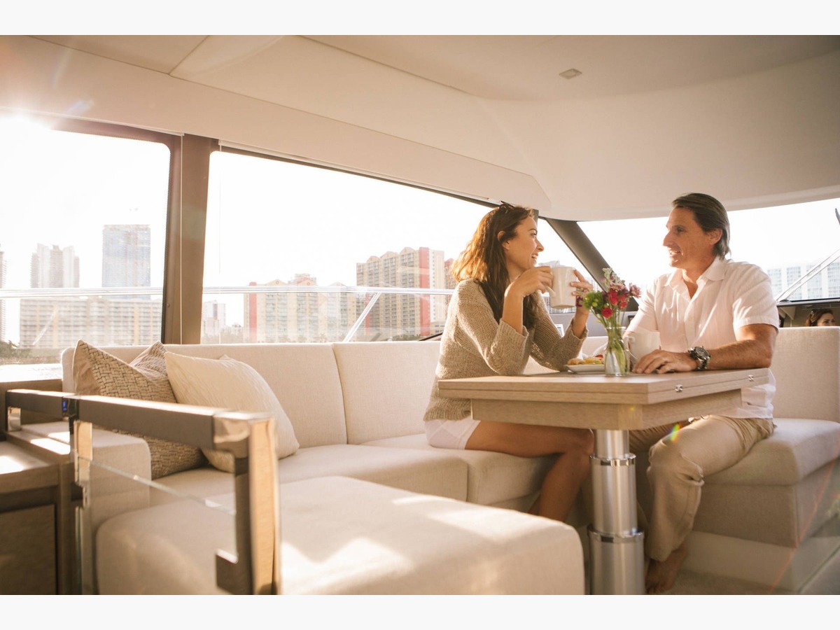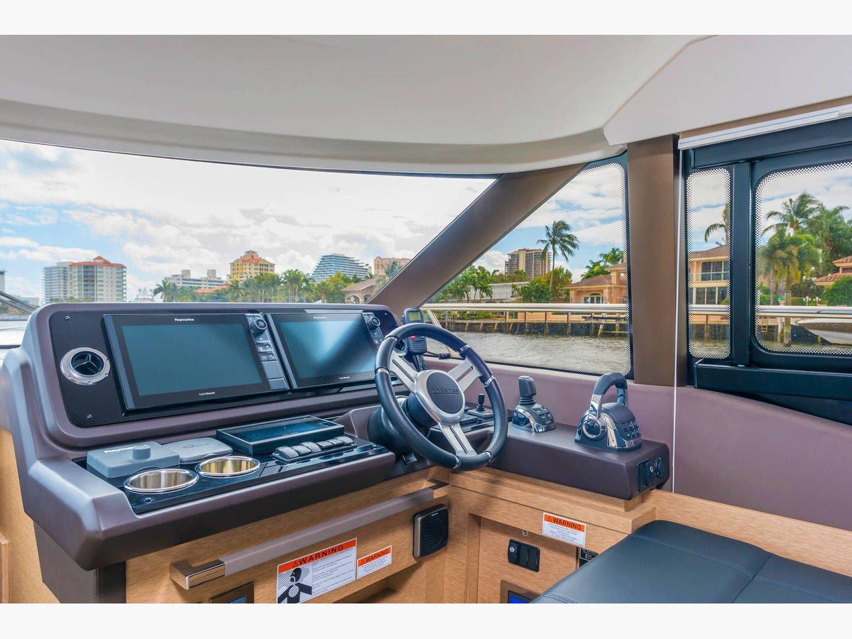 À bord, les volumes et la lumière sont au cœur de l’expérience. Le salon panoramique et la cuisine ouverte sur le cockpit créent un espace de vie fluide et convivial, tandis que le flybridge accueille un grand bain de soleil et un coin repas pour profiter pleinement de chaque mouillage. En version 2 cabines, la Prestige 460 FLY propose une superbe cabine propriétaire « wide body » occupant la majeure partie de la largeur, ainsi qu’une seconde cabine double idéale pour vos invités.