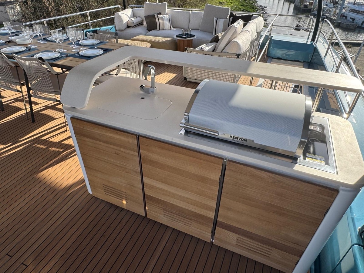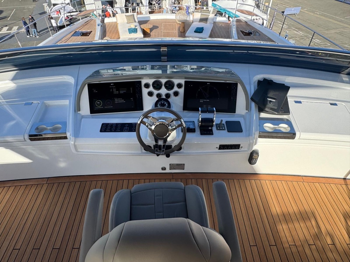 The panoramic saloon, flooded with natural light, becomes the true heart of the yacht. It is both a sumptuous entertaining space and a peaceful living area, where interior and exterior are in constant dialogue. The aft cockpit naturally extends this art of hosting, while the vast, beautifully integrated flybridge creates a unique atmosphere combining helm station, relaxation and pure contemplation.